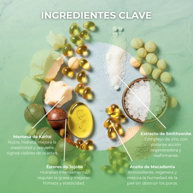Su novedosa formulación incorpora ingredientes de última generación como es el Extracto de Smithsonite, un complejo de zinc que actúa eficazmente en la regeneración celular de la piel mejorando la firmeza y elasticidad de los tejidos.
