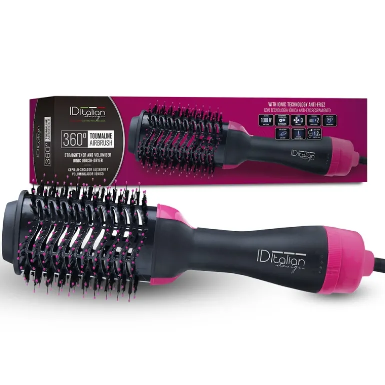 Todas las ventajas de un cepillo profesional y de un secador de alta tecnología unidas en un solo aparato: 360 Toumalin AirBrush. La Tecnología Iónica por turmalina: En cada secado se liberan millones de iones negativos con los que se consiguen unos resultados espectaculares: Tu cabello lucirá sin encrespamiento, más fácil de peinar, más sano, cuidado y con más brillo, tardarás menos tiempo en secártelo y por lo tanto el pelo recibirá menos daño por exposición al calor.