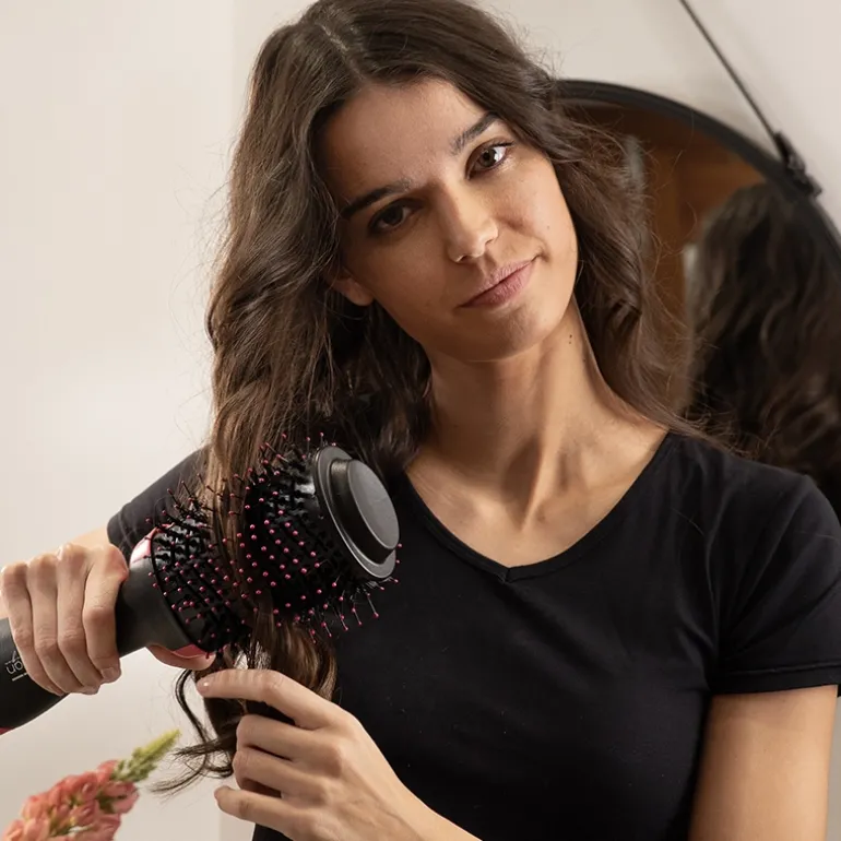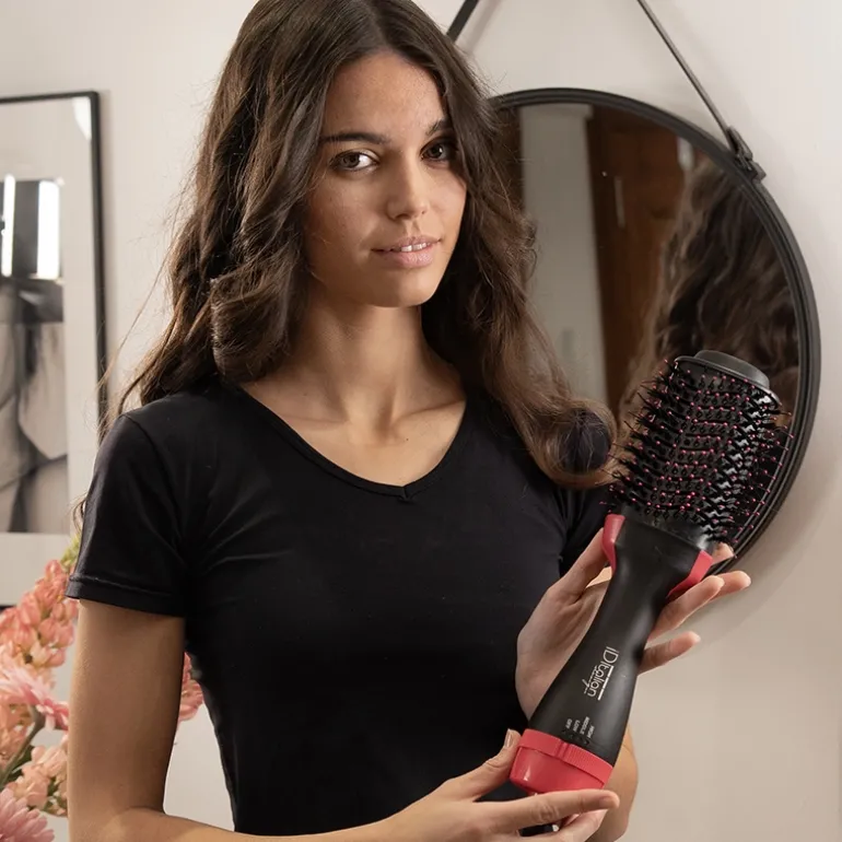 Su ergonomía y ligereza hacen que este cepillo-secador sea muy fácil de usar. La forma ovalada y composición del cepillo permiten peinar, secar, alisar y dar volumen al cabello con menos pasadas, protegiéndolo y ahorrando tiempo, ya que está compuesto por dos tipos de púas: gruesas con punta en bola que agarran el cabello y lo dirige hacia las púas interiores que se encargan de estirarlo y peinarlo sin tirones y mientras recibe calor de manera uniforme, obteniendo así un acabado profesional de forma rápida y fácil.