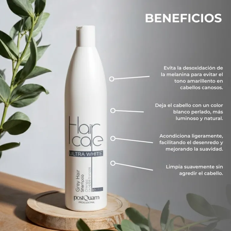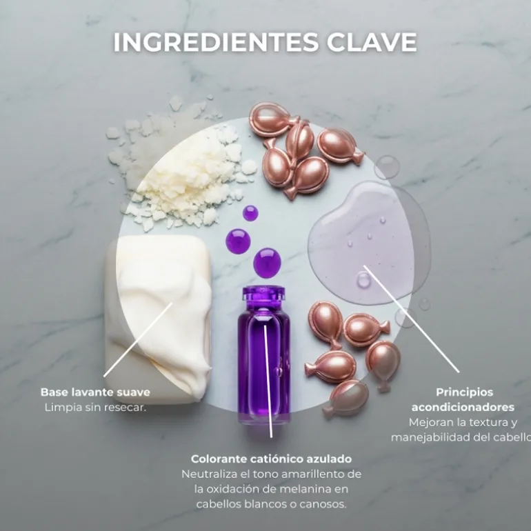 Evita la desoxidación de la melanina, eliminando el color amarillento de los cabellos canosos y dejando el cabello suave, brillante y con un agradable color blanco perlado.
