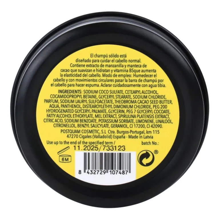 El champú sólido está diseñado para cuidar el cabello normal. Contiene extracto de manzanilla y manteca de cacao que suavizan e hidratan y vitamina B5que aumenta la elasticidad del cabello.