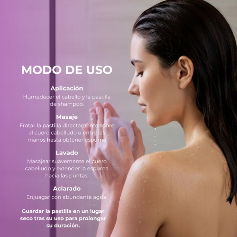 Humedecer el cabello y con movimientos circulares pasar la barra de champú por el cabello para hacer espuma. Aclarar cuidadosamente con agua tibia.