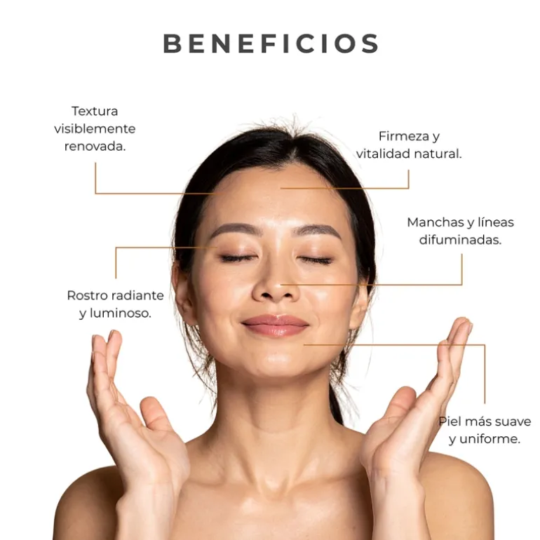 Por lo que mejora notablemente la apariencia de la piel, reduciendo manchas y cicatrices, arrugas e imperfecciones y añadiendo luminosidad y vitalidad al rostro.