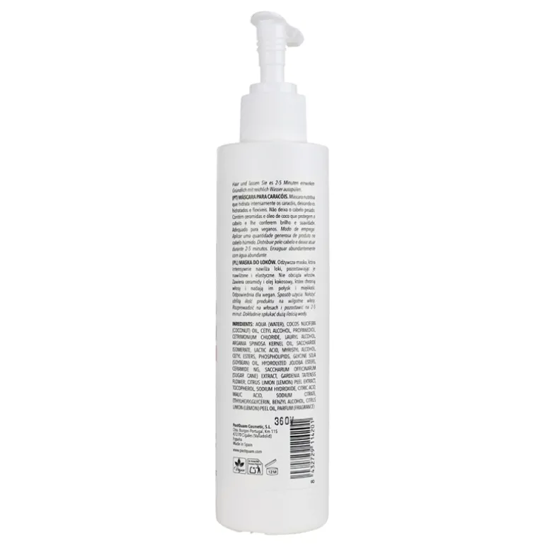 Mascarilla nutritiva que hidrata en intensidad el rizo dejándolo hidratado y flexible. No apelmaza el cabello. Contiene ceramidas y aceite de coco que protegen el cabello y le dan brillo y suavidad. Apto para veganos.