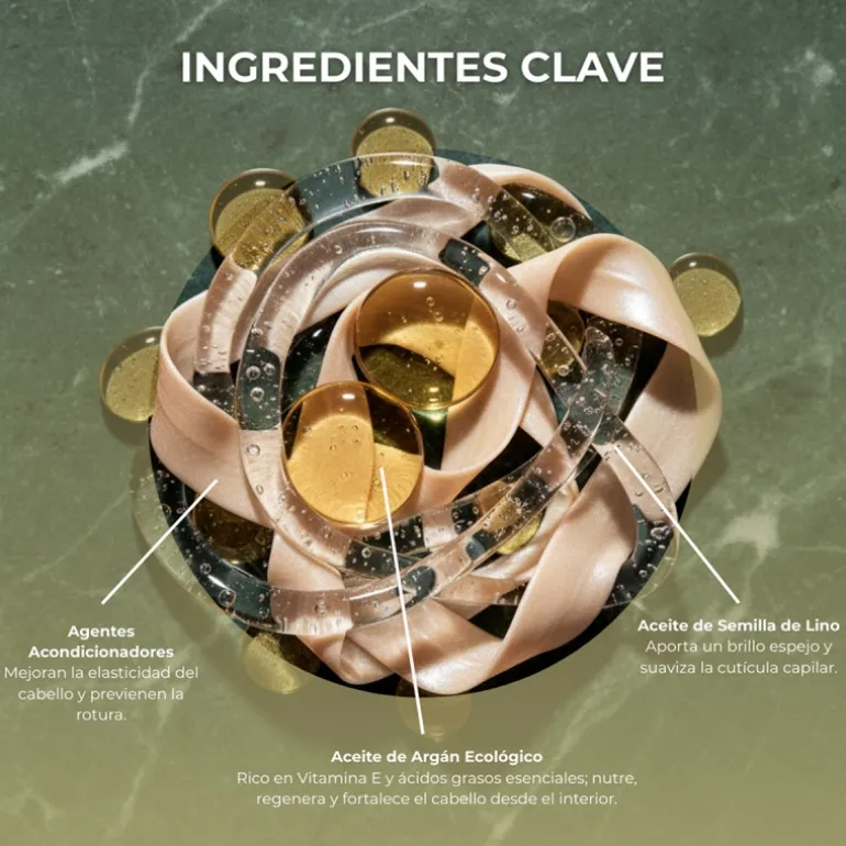 ACEITE DE ARGÁN: El aceite de argán es un aceite mundialmente conocido y muy apreciado en el mundo de la cosmética. Se obtiene a partir de la nuez del árbol de argán que durante siglos ha sido usada en el mediterráneo por sus propiedades cosméticas para obtener un cabello y piel saludables. Es rico en vitaminas, ácidos grasos, minerales y antioxidantes. Aporta brillo, suavidad y nutrición.