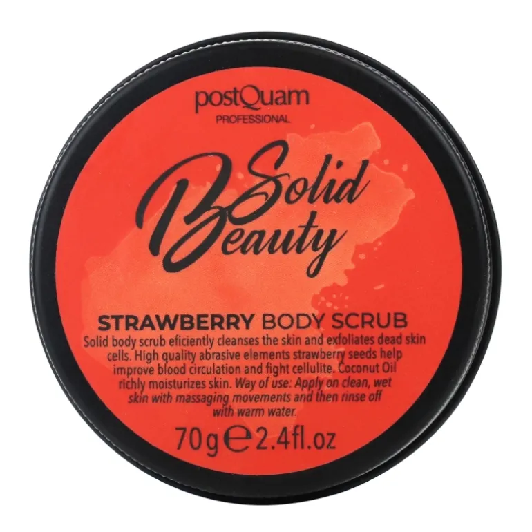 El exfoliante corporal sólido limpia eficazmente la piel y exfolia las células muertas. Los elementos abrasivos de alta calidad de las semillas de fresa ayudan a mejorar la circulación sanguínea y a combatir la celulitis. El aceite de coco hidrata la piel.