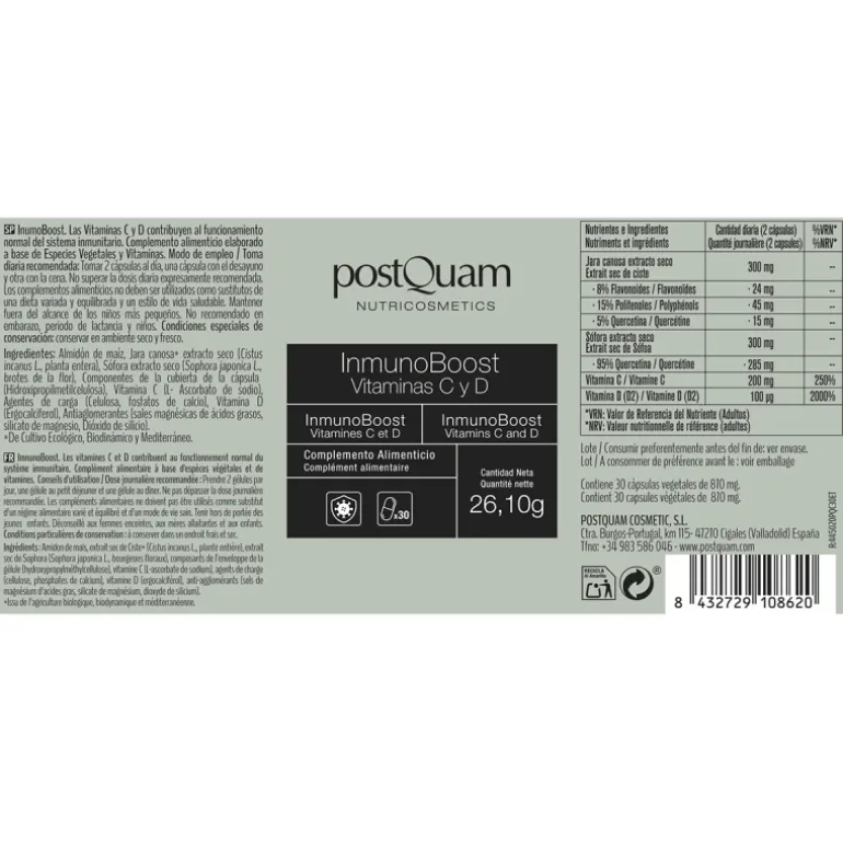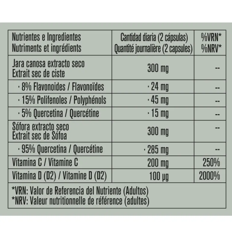 Complemento alimenticio elaborado a base de Especies Vegetales y Vitaminas. Las Vitaminas C y D contribuyen al funcionamiento normal del sistema inmunitario. No superar la dosis diaria expresamente recomendada. Los complementos alimenticios no deben ser utilizados como sustitutos de una dieta variada y equilibrada y un estilo de vida saludable. Mantener fuera del alcance de los niños. No recomendado en embarazo, periodoo de lactancia y niños. Condiciones especiales de conservación: conservar en ambiente seco y fresco.
