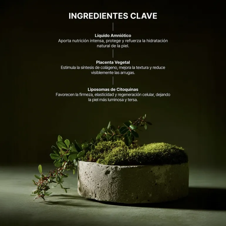 Formulado con siete principios activos de alta penetración, de entre los cuales destacamos la placenta vegetal, el líquido amniótico y los liposomas de citoquinas.