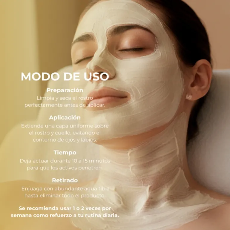 ¿Cómo lo aplico?Aplicar una capa de producto sobre la piel limpia y seca evitando el contorno de los ojos.Dejar actuar unos 20 minutosRetirar suavemente con los dedos realizando pequemos movimientos circulares y aclarar con agua templada utilizando una esponja húmeda.