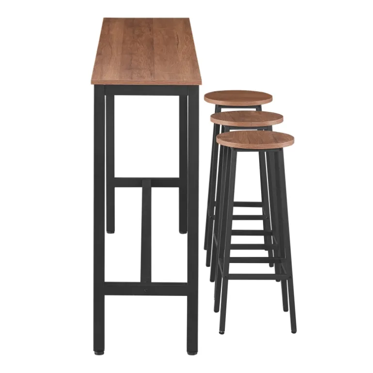 La mesa y los taburetes están diseñados con materiales de alta calidad. El MDF con recubrimiento en melanina de acabado madera natural proporciona una superficie duradera y fácil de limpiar, mientras que la estructura metálica con recubrimiento en negro asegura estabilidad y resistencia. Los taburetes, además de ser visualmente atractivos, cuentan con un diseño funcional que permite colocarlos debajo de la mesa cuando no están en uso, optimizando así el espacio disponible.
