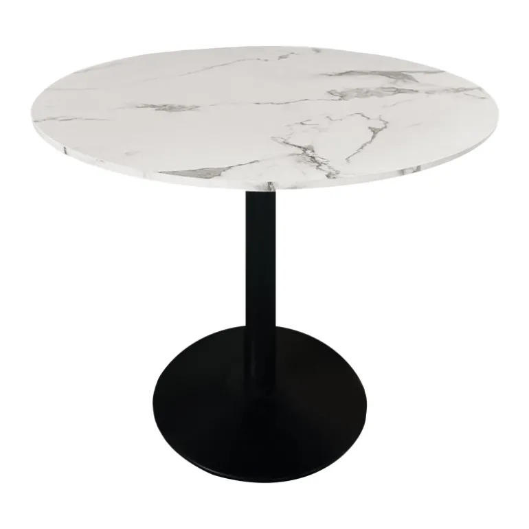 Esta mesa de diseño clásico, elegante y atemporal se integra a la perfección en cualquier ambiente, ya sea en el hogar o en el lugar de trabajo. Su tablero redondo de 100 cm de diámetro y la firme base redonda a juego aportan un toque de refinamiento y distinción. La superficie de la mesa está confeccionada en MDF con un acabado realista de mármol, mientras que su estructura metálica con recubrimiento negro añade un aire de sofisticación, elevando la decoración de cualquier espacio.
