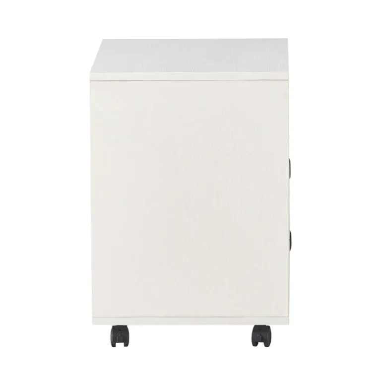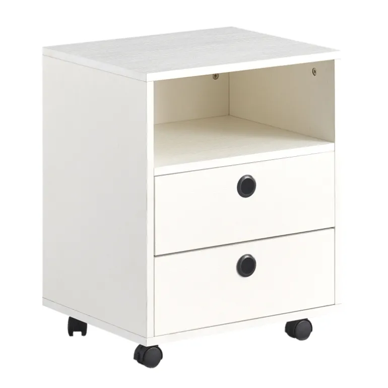 La mesilla de noche cuenta con dos cajones espaciosos que ofrecen un almacenamiento práctico y accesible, ideal para mantener tus objetos personales organizados y al alcance de la mano. Además, dispone de un hueco adicional que proporciona un espacio extra para libros, revistas o cualquier otro artículo que desees tener a la vista. Las cuatro ruedas, fabricadas en plástico resistente, permiten un desplazamiento suave y fluido, ofreciendo total libertad de movimiento para reubicarla según tus necesidades.