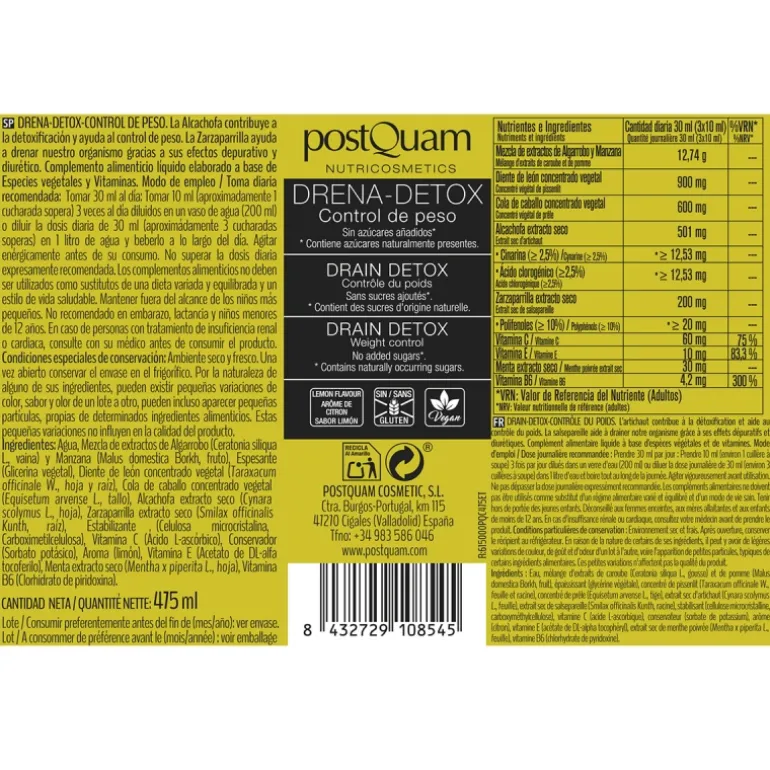La Alcachofa contribuye a la detoxificación y ayuda al control de peso. La Zarzaparrilla ayuda a drenar nuestro organismo gracias a sus efectos depurativo y diurético. Complemento alimenticio líquido elaborado a base de Especies vegetales y Vitaminas.