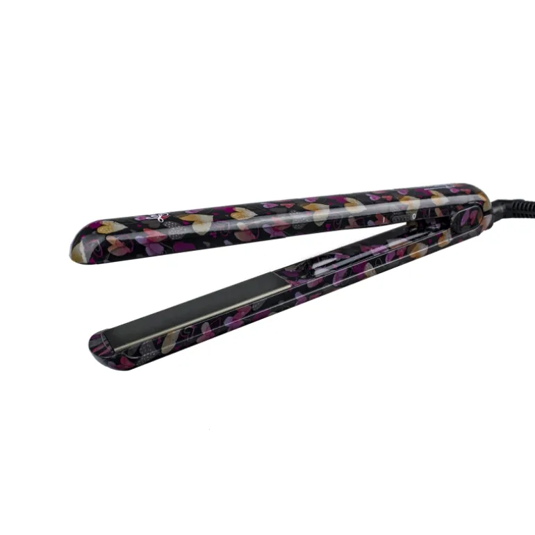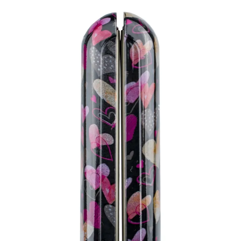Plancha profesional con cuerpo estampado con corazones. De diseño profesional, esta plancha incorpora placas de titanio para un mayor cuidado del cabello, evitando daños y sequedad. Respeta las fibras capilares mientras consigue un alisado perfecto