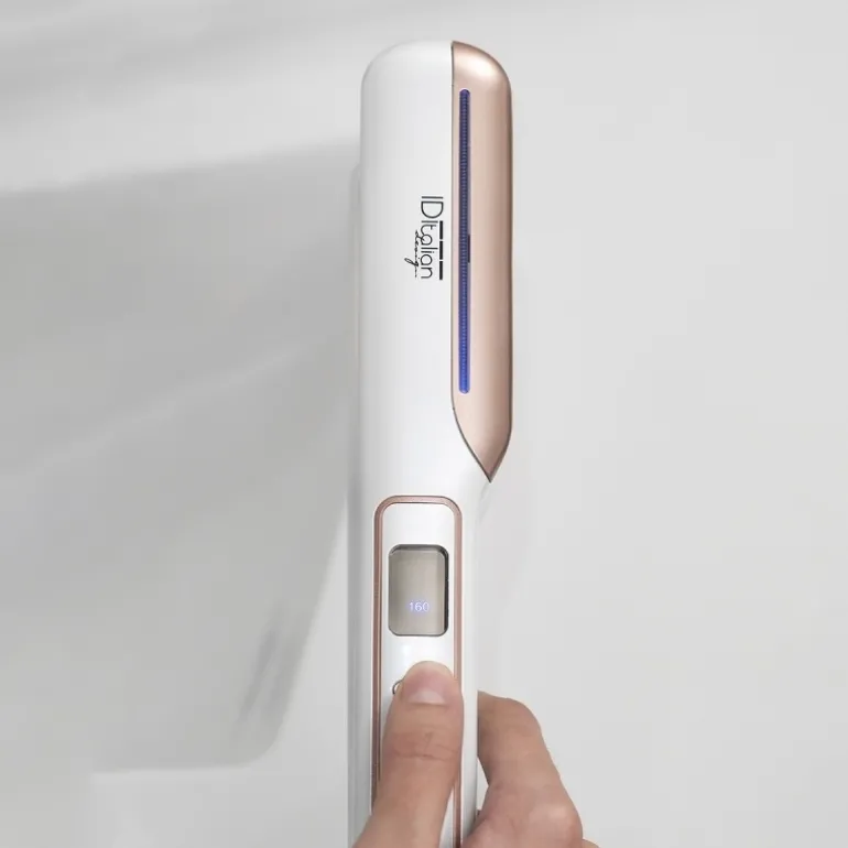 Plancha profesional con placas de cerámica. En dos colores nacar y rosa que la hace elegante y delicada al vista. Dispone de display digital retroiluminado y un indicador led de encedido a lo largo de la placa superior.