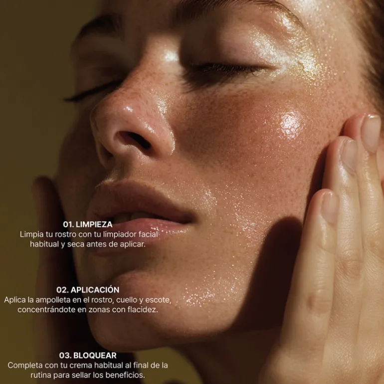 · Con la piel del rostro limpia y seca, verter el contenido de la ampolla sobre las manos.