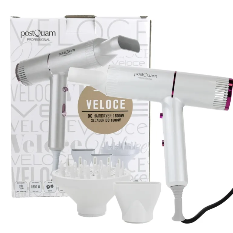 El secador Veloce es un elegante secador de pelo de corte minimalista de líneas puras y estilizadas. Muy ligero y potente gracias a su motor DC de 1600w. Provisto de dos boquillas y un difusor para los acabados más profesionales.