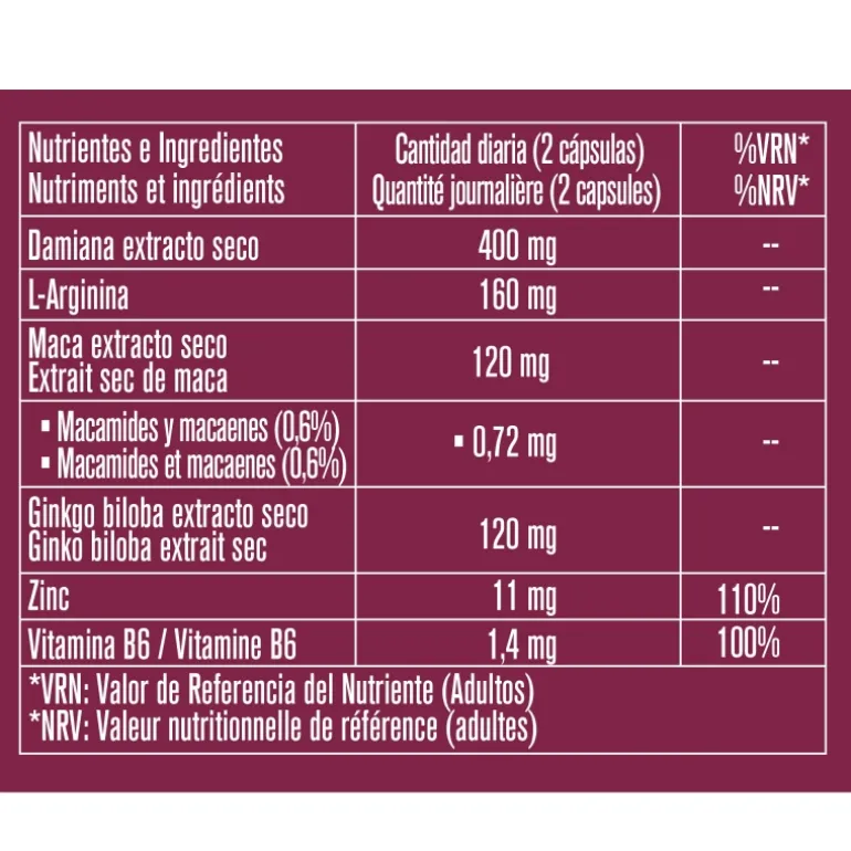 Complemento alimenticio elaborado a base de Especies vegetales, Aminoácidos, Minerales y Vitaminas. La Maca ayuda al mantenimiento de las relaciones y junto con la Damiana contribuye a un buen apetito sexual. El zinc contribuye a la fertilidad y reproducción normal y al mantenimiento de niveles normales de testosterona, mientras que la Vitamina B6 nos ayuda a reducir el cansancio y la fatiga y contribuye al metabolismo energético normal. No superar la dosis diaria expresamente recomendada. Los complementos alimenticios no deben ser utilizados como sustitutos de una dieta variada y equilibrada y un estilo de vida saludable. Mantener fuera del alcance de los niños. Consulte a su médico en caso de tomar simultáneamente anticoagulantes o antidiabéticos. No recomendado durante el embarazo y lactancia. Condiciones especiales de conservación: conservar en ambiente seco y fresco.