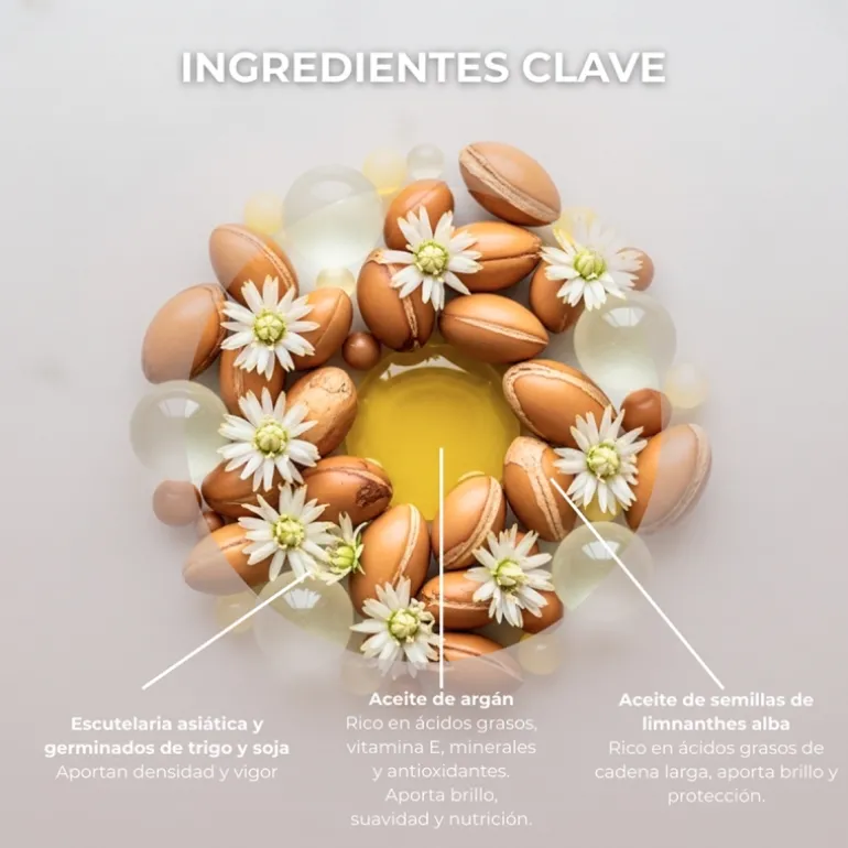 ACEITE DE ARGÁN: El aceite de argán es un aceite mundialmente conocido y muy apreciado en el mundo de la cosmética. Se obtiene a partir de la nuez del árbol de argán que durante siglos ha sido usada en el mediterráneo por sus propiedades cosméticas para obtener un cabello y piel saludables. Es rico en vitaminas, ácidos grasos, minerales y antioxidantes. Aporta brillo, suavidad y nutrición.
