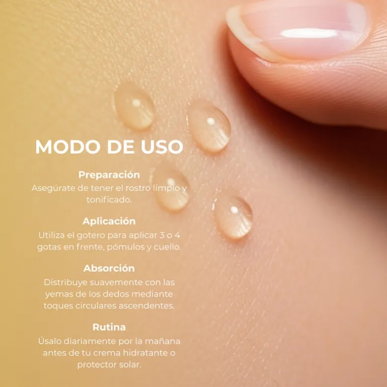 - Con la piel del rostro limpia y seca, dejar caer unas gotas del serum sobre las yemas de los dedos y aplicarlo dando ligeros toquecitos hasta su total absorción.