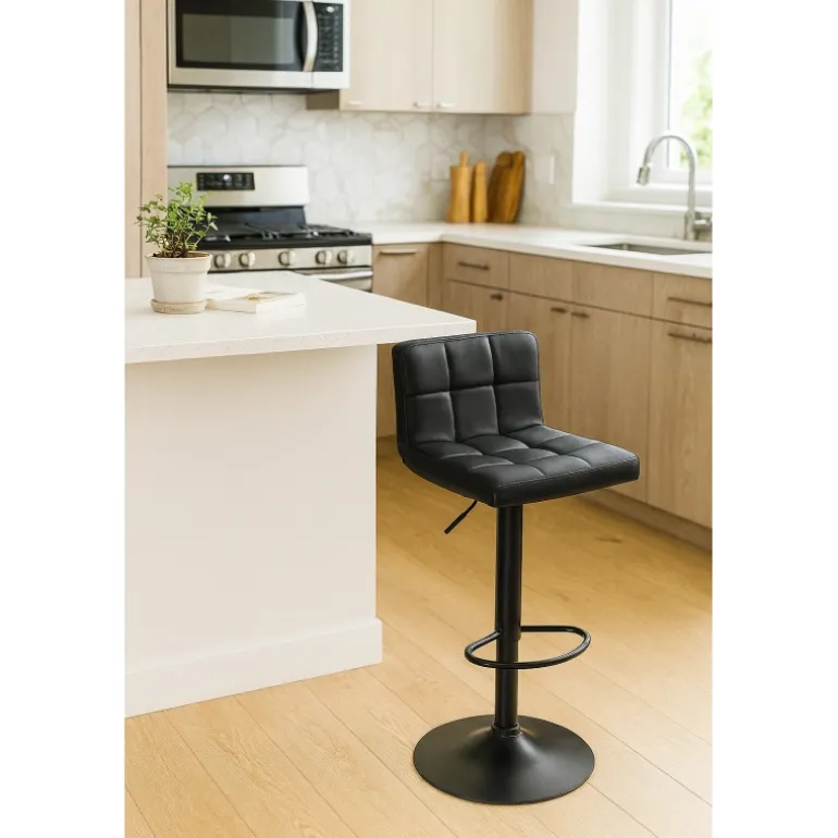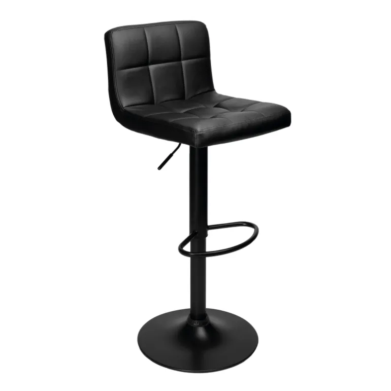 Este taburete de estilo contemporáneo y elegante es una adquisición sofisticada para cualquier empresa u hogar. Con su diseño moderno, el taburete no solo aporta un ambiente contemporáneo, sino que también garantiza una comodidad excepcional gracias a su asiento giratorio de 360 grados y su respaldo acolchado ergonómico. Fabricado en piel sintética negra, el asiento está decorado con pespuntes cuadrados que realzan su apariencia sofisticada.