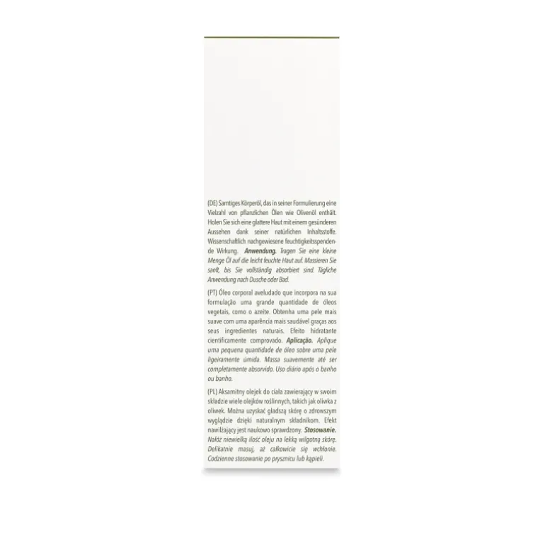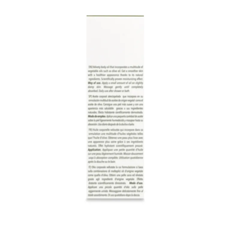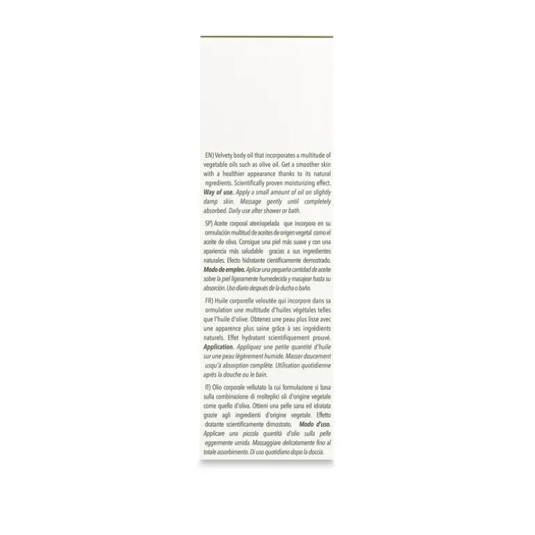 Protege, hidrata y cuida tu piel con el Aceite corporal Olive. Formulado con aceite de almendras, de girasol, de macadamia y de oliva. Se absorbe rápidamente y previene la sequedad cutánea. No deja sensación grasa. Ideal para mantener tu piel suave y brillante.