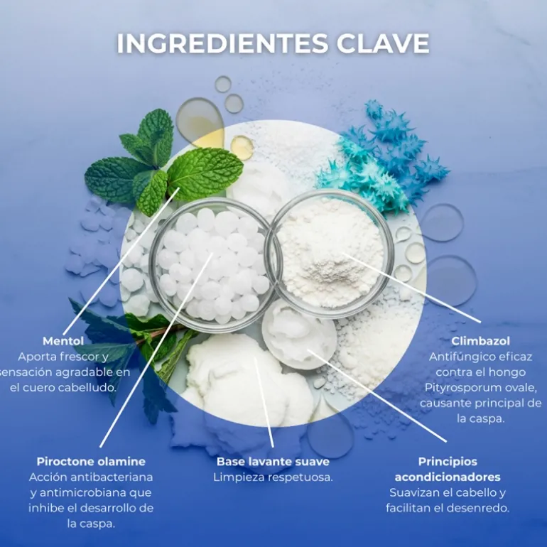 CLIMBAZOLE: Ingrediente con actividad antifúngica. Es altamente eficaz contra el hongo Pityrosporum ovale, principal causante de la caspa en el cuero cabelludo.
