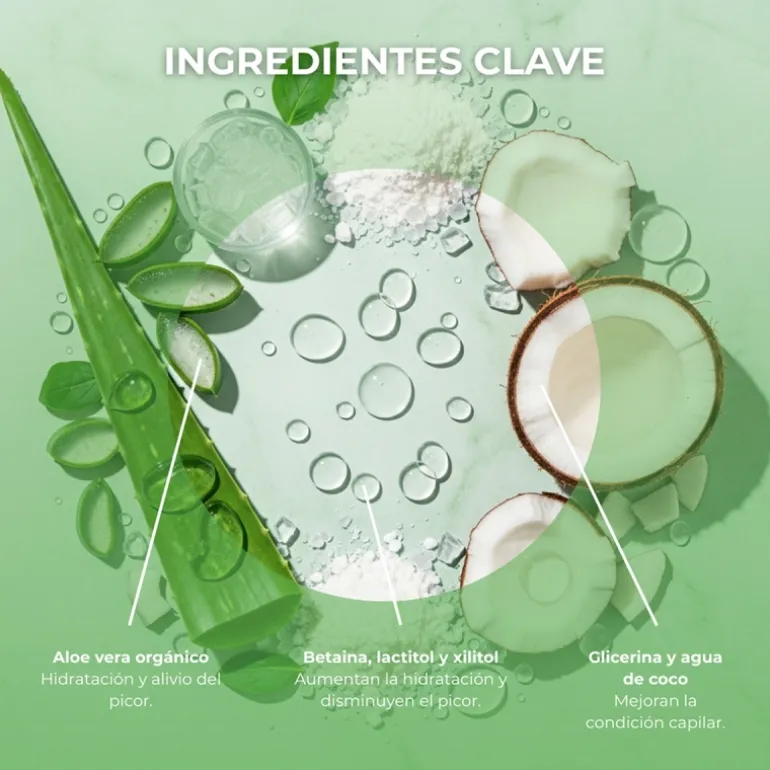 Formulado con aloe vera orgánico que aporta hidratación y disminuye la sensación de picor en el cuero cabelludo. Su fórmula testada bajo control dermatológico incluye betaina, lactitol y xilitol que aumentan la