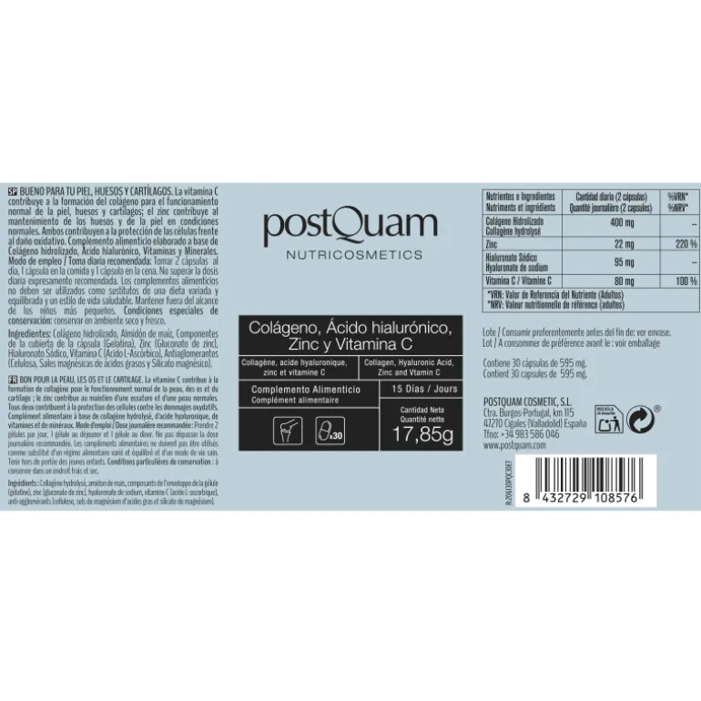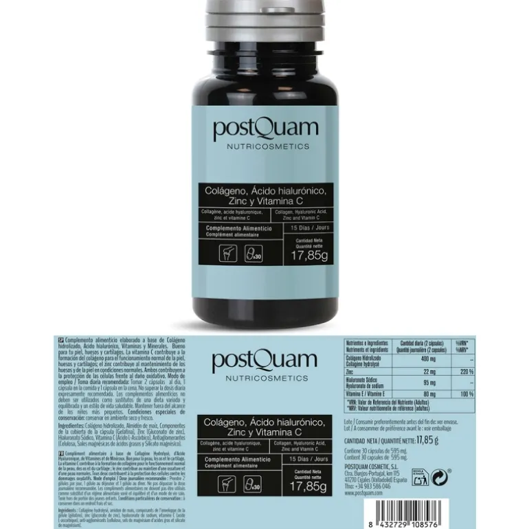 Complemento alimenticio elaborado a base de Colágeno hidrolizado, Ácido hialurónico, Vitaminas y Minerales. Bueno para tu piel, huesos y cartílagos. La vitamina C contribuye a la formación del colágeno para el funcionamiento normal de la piel, huesos y cartílagos; el zinc contribuye al mantenimiento de los huesos y de la piel en condiciones normales. Ambos contribuyen a la protección de las células frente al daño oxidativo. No superar la dosis diaria expresamente recomendada. Los complementos alimenticios no deben ser utilizados como sustitutos de una dieta variada y equilibrada y un estilo de vida saludable. Mantener fuera del alcance de los niños más pequeños. Condiciones especiales de conservación: conservar en ambiente seco y fresco.
