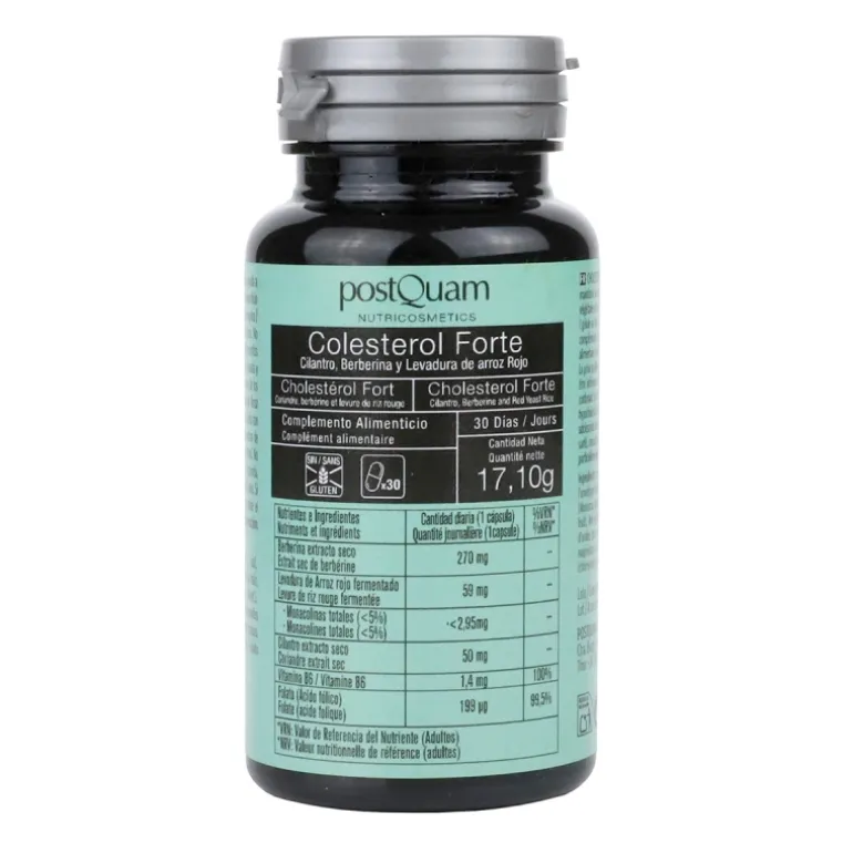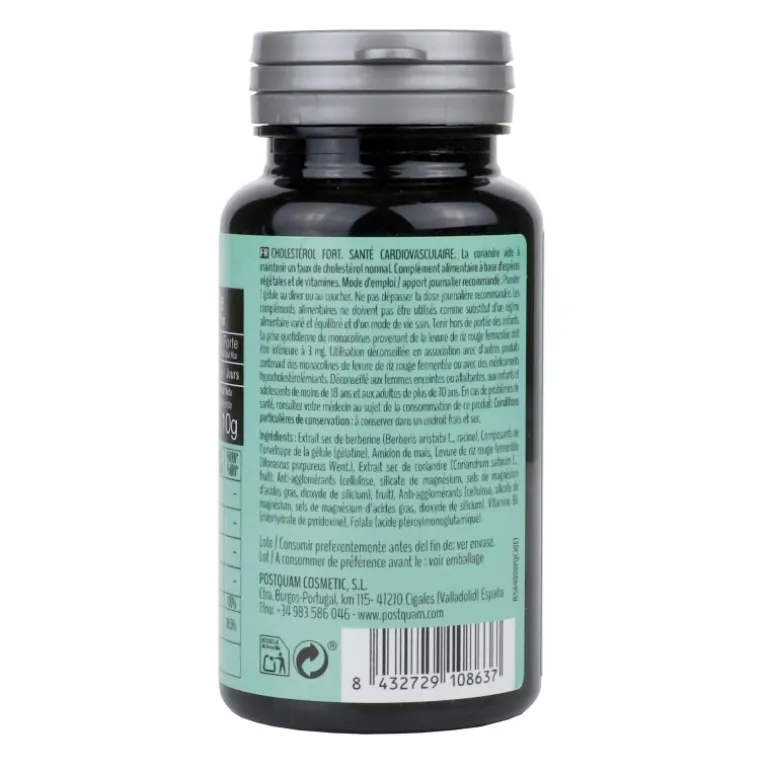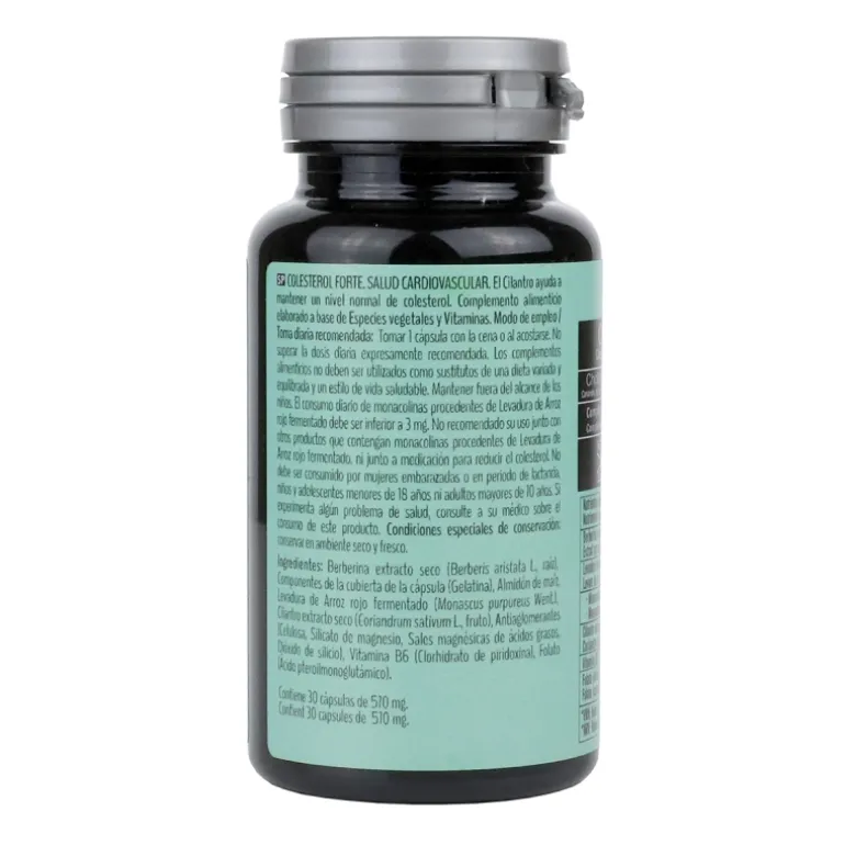 SALUD CARDIOVASCULAR. Complemento alimenticio elaborado a base de Especies vegetales y Vitaminas. El Cilantro ayuda a mantener un nivel normal de colesterol. No superar la dosis diaria expresamente recomendada. Los complementos alimenticios no deben ser utilizados como sustitutos de una dieta variada y equilibrada y un estilo de vida saludable. Mantener fuera del alcance de los niños. El consumo diario de monacolinas procedentes de Levadura de Arroz rojo fermentado debe ser inferior a 3 mg. No recomendado su uso junto con otros productos que contengan monacolinas procedentes de Levadura de Arroz rojo fermentado, ni junto a medicación para reducir el colesterol. No debe ser consumido por mujeres embarazadas o en periodo de lactancia, niños y adolescentes menores de 18 años ni adultos mayores de 70 años. Si experimenta algún problema de salud, consulte a su médico sobre el consumo de este producto. Condiciones especiales de conservación: conservar en ambiente seco y fresco.