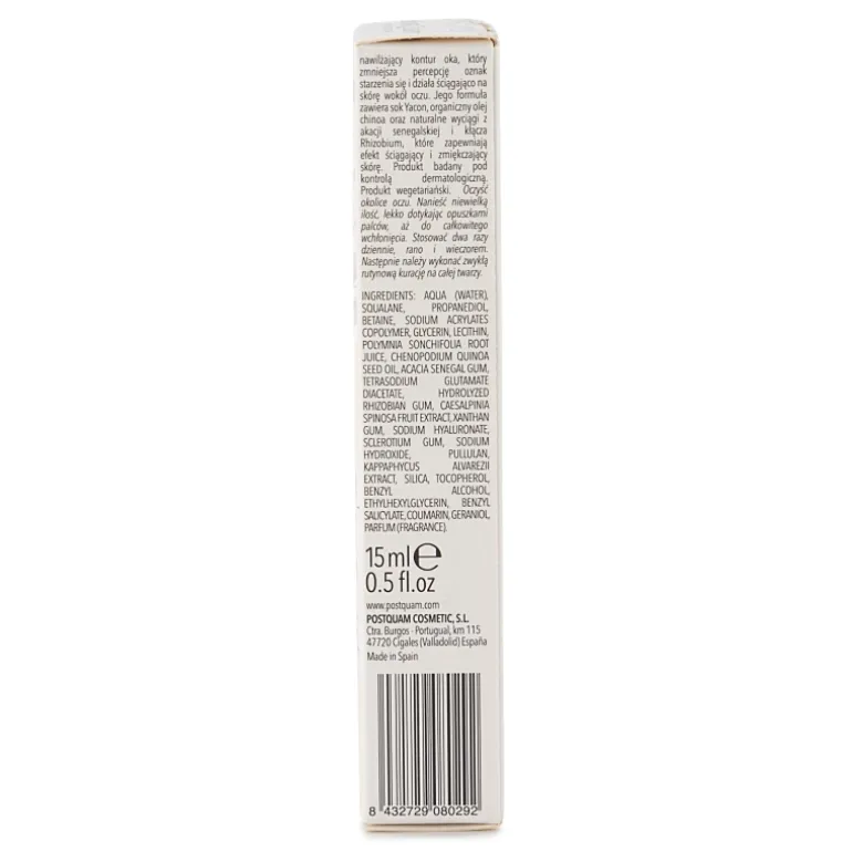 Contorno de ojos hidratante de rápida absorción que reduce la percepción de los signos de la edad y produce un efecto tensor en la piel del contorno ocular. Alisa y mejora el aspecto de la piel. Su formulación incluye jugo de Yacón que es rico en fructo-oligosacáridos que actúan como prebióticos. Los prebióticos ayudan en la regulación de la microbiota normal de la piel y mantienen su microflora beneficiosa en niveles óptimos. También incorpora aceite de quínoa de origen orgánico que ayuda a disminuir los signos visibles de la edad e ingredientes naturales procedentes de la acacia Senegal y del Rhizobium que proporcionan un efecto tensor que suaviza la piel. Su formulación incorpora extractos naturales de árbol de tara y de alga Kappahycus alvarezii con propiedades tensoras y protectoras.