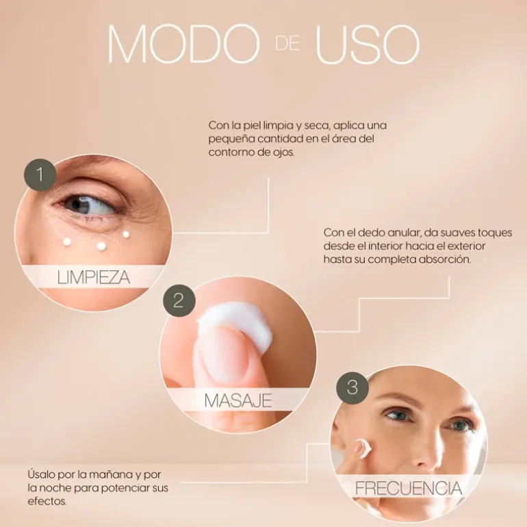 Limpiar la zona del contorno de los ojos y aplicar una pequeña cantidad mediante ligeros toques hasta su total absorción. Aplicar dos veces al día, mañana y noche.