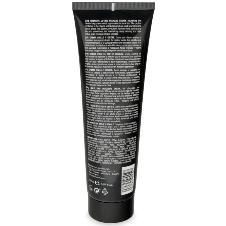 Crema con efecto nutritivo e hidratante que regenera la piel del cuello y escote. Los péptidos que contienen la kigelia y la Quillaja producen una renovación celular y un efecto tensor. La elastina, el ácido hialurónico y el oro, proporciona a la piel suavidad, reafirmación e hidratación.