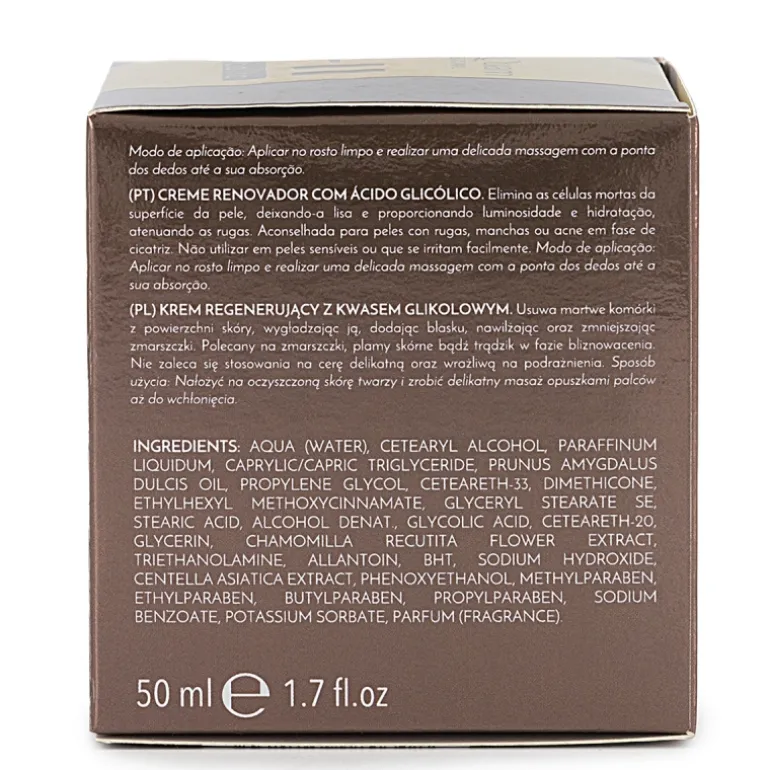 Ácido Glicólico: El ácido glicólico tiene la cualidad de ayudar a eliminar las células muertas de la superficie de la piel y estimular la regeneración de las nuevas. Por lo que mejora notablemente la apariencia de la piel, reduciendo manchas y cicatrices, arrugas e imperfecciones y añadiendo luminosidad y vitalidad al rostro.