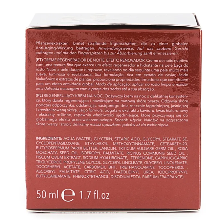 Crema nutritiva facial de noche de textura fina que ejerce un efecto regenerante e hidratante sobre la piel apagada del rostro. Nutre la piel durante el descanso, revelando al día siguiente una piel mucho más suave, brillante y revitalizada. Su formulación rica en extracto de caviar, ácido hialurónico y extractos vegetales proporciona propiedades reafirmantes que contribuyen a un efecto anti-edad global.