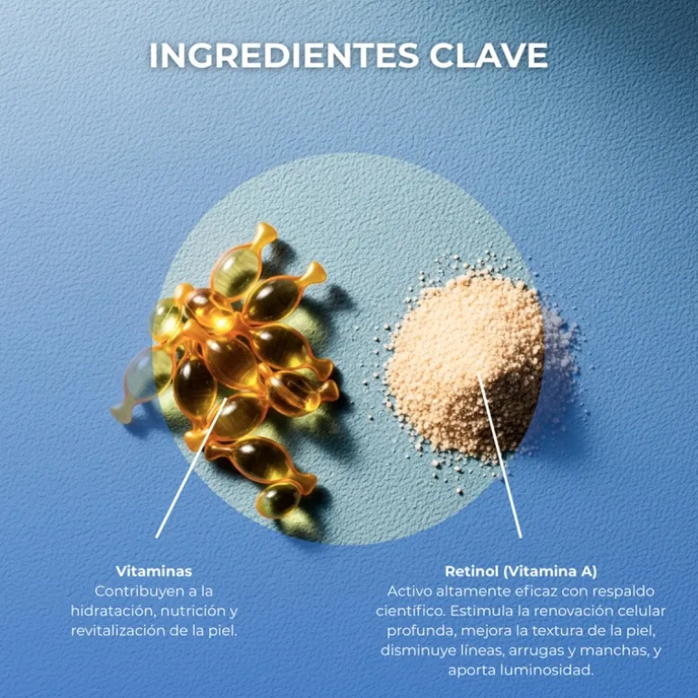 Retinol: es un activo derivado de la Vitamina A de uso común que tiene la capacidad de estimular la producción natural de colágeno y elastina, consiguiendo la disminución de arrugas y manchas en la piel, renovándola desde capas profundas gracias a su bajo peso molecular y liposoluble, pero que a su vez, mejora el aspecto de la capa superior, cerrando el poro, aportando luminosidad al rostro, igualando el tono y mejorando el aspecto globar de la piel.