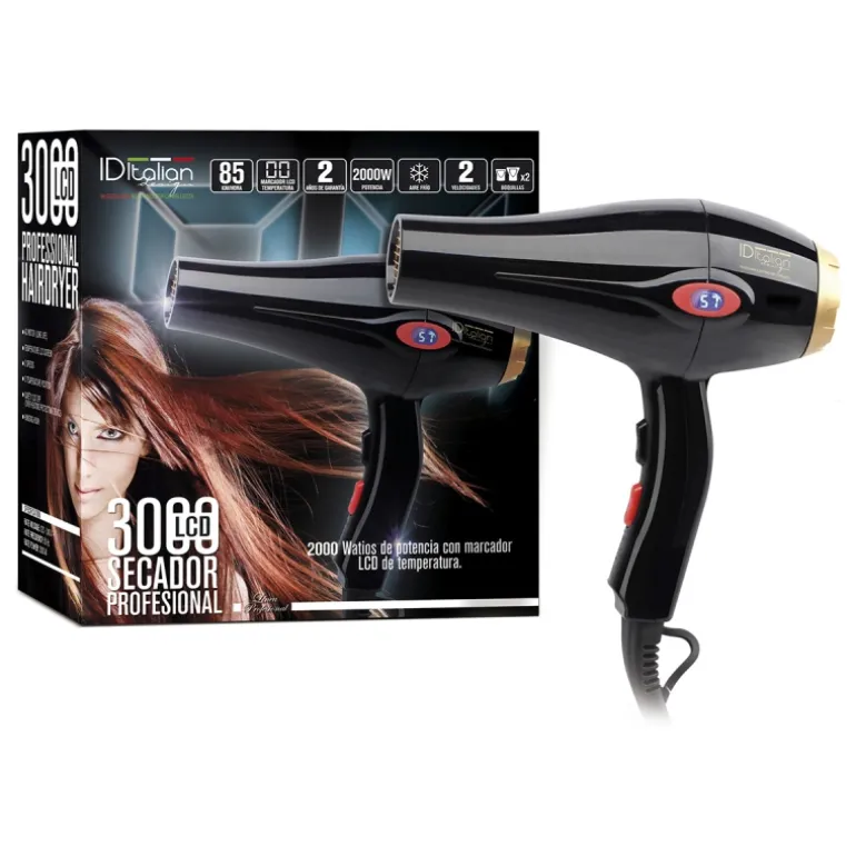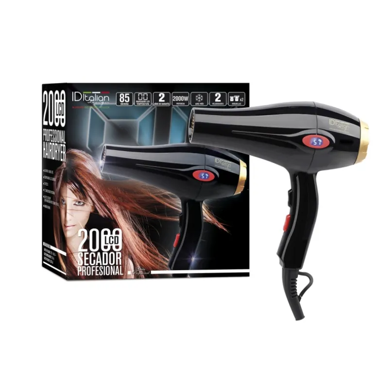Secador profesional con 2000W de potencia. Dispone de una pantalla LCD que indica la temperatura del aire del secador. Selector de 3 modos de temperatura y selector de 2 modos de velocidad. La tapa trasera es removible par a optimizar la limpieza del filtro. Dispone de un gancho para colgar e incluye 2 boquillas. Secador profesional. Motor AC de larga duración; 2000W depotencia; velocidad del aire 85 km/h; Marcador lcd de temperatura; selector de 3 modos de temperatur a y dos elocidades; botórío; filtro desmontalbe. Incluye boquillas.