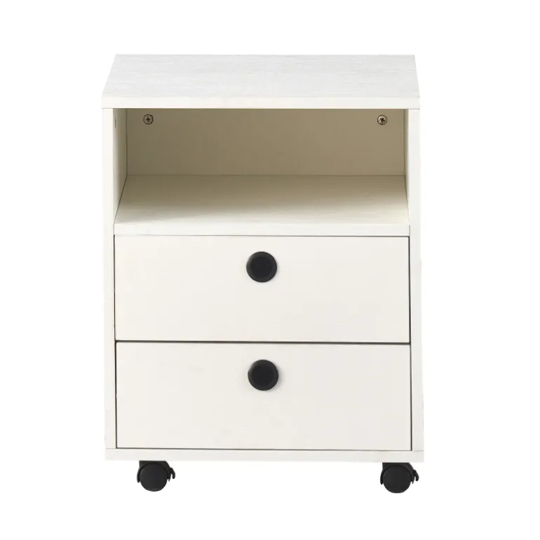 La mesilla de noche cuenta con dos cajones espaciosos que ofrecen un almacenamiento práctico y accesible, ideal para mantener tus objetos personales organizados y al alcance de la mano. Además, dispone de un hueco adicional que proporciona un espacio extra para libros, revistas o cualquier otro artículo que desees tener a la vista. Las cuatro ruedas, fabricadas en plástico resistente, permiten un desplazamiento suave y fluido, ofreciendo total libertad de movimiento para reubicarla según tus necesidades.