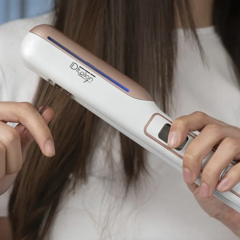 Plancha profesional con placas de cerámica. En dos colores nacar y rosa que la hace elegante y delicada al vista. Dispone de display digital retroiluminado y un indicador led de encedido a lo largo de la placa superior.