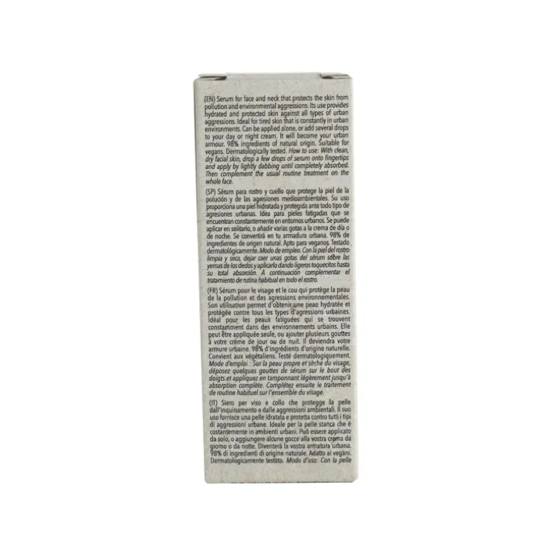 Sérum para rostro y cuello que protege la piel de la polución y de las agresiones medioambientales. Su uso proporciona una piel hidratada y protegida ante todo tipo de agresiones urbanas. Idea para pieles fatigadas que se encuentran constantemente en entornos urbanos. Se puede aplicar en solitario, o añadir varias gotas a la crema de día o de noche. Se convertirá en tu armadura urbana.