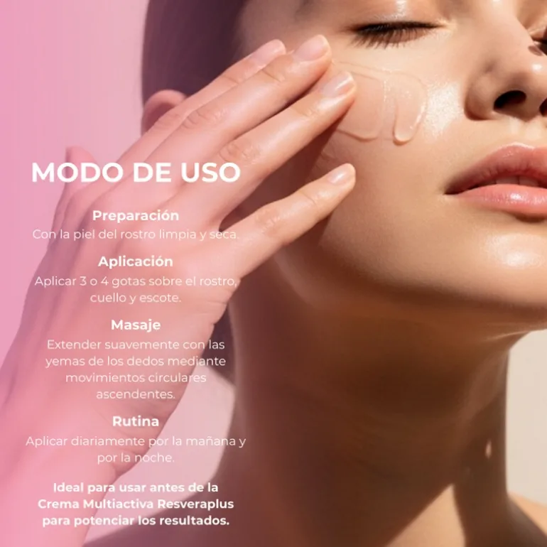 - Con la piel del rostro limpia y seca, dejar caer unas gotas del sérum sobre las yemas de los dedos y aplicarlo dando ligeros toquecitos hasta su total absorción.