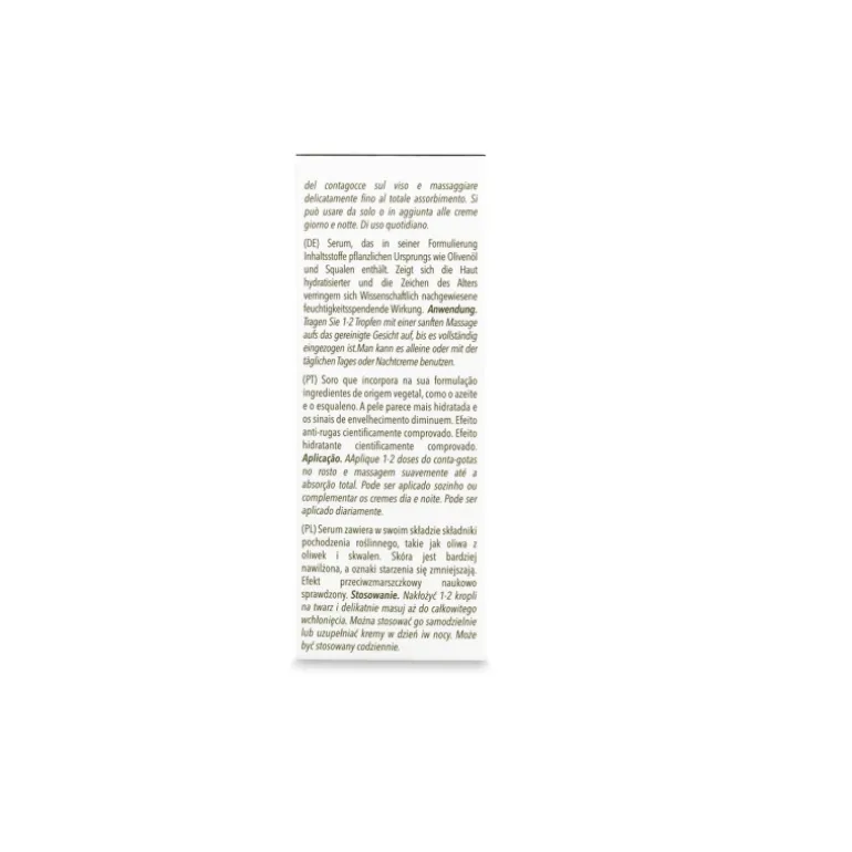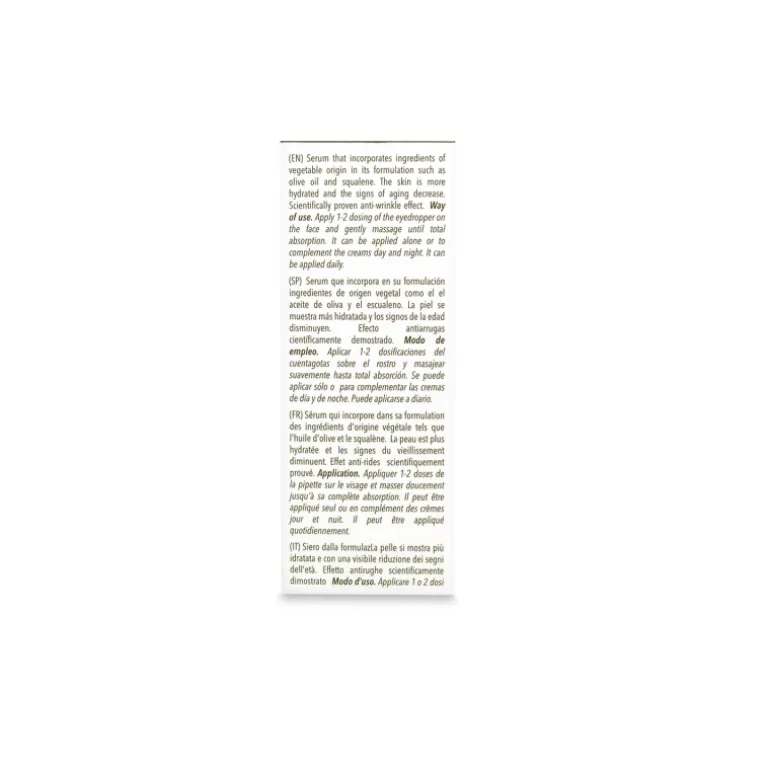 Sérum facial control-edad formulado con ingredientes de origen vegetal como los aceites de Oliva, Germen de trigo y Soja. La combinación de péptidos junto con el ácido hialurónico le proporciona a tu piel la firmeza y elasticidad que necesita, reduciendo en profundidad el aspecto de las arrugas y líneas de expresión. La piel hidratada, recupera toda su luminosidad y energía.