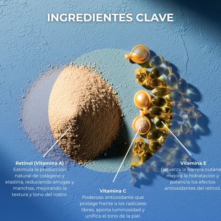 Retinol: es un activo derivado de la Vitamina A de uso común que tiene la capacidad de estimular la producción natural de colágeno y elastina, consiguiendo la disminución de arrugas y manchas en la piel, renovándola desde capas profundas gracias a su bajo peso molecular y liposoluble, pero que a su vez, mejora el aspecto de la capa superior, cerrando el poro, aportando luminosidad al rostro, igualando el tono y mejorando el aspecto globar de la piel.