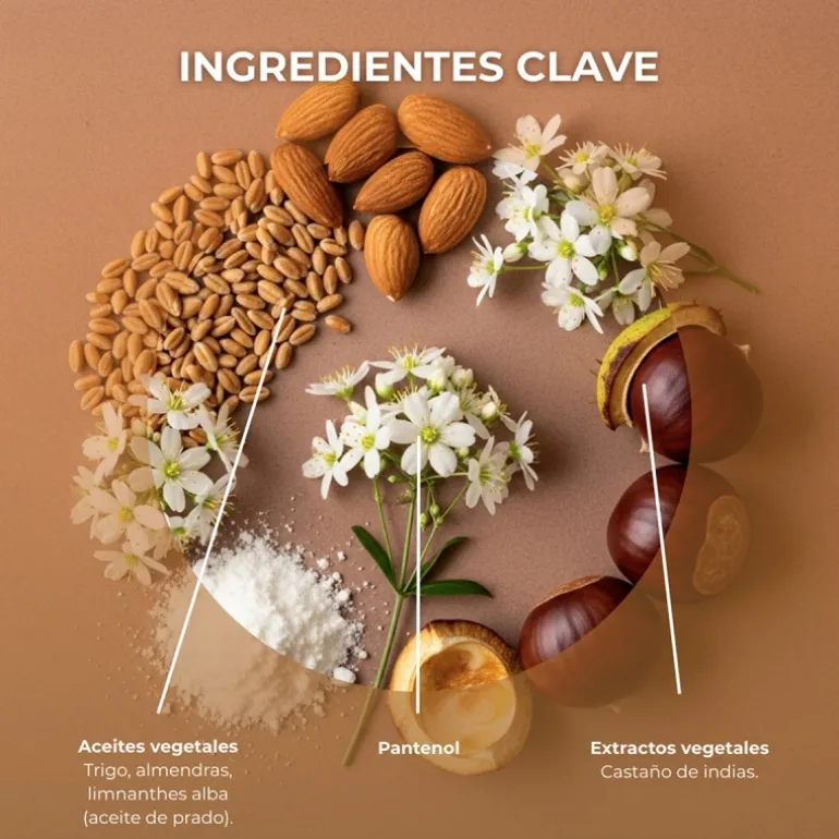 Contiene filtro solar, aceites vegetales (trigo, almendras y limantes alba o aceite de prado), extracto s vegetales(castaño de indias) , y pantenol.