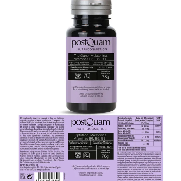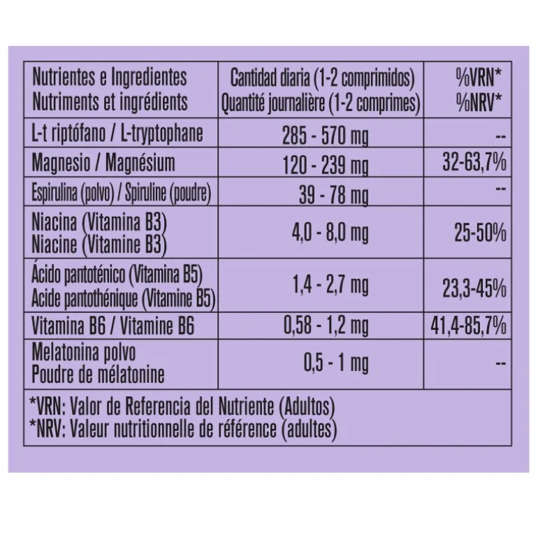 Complemento alimenticio elaborado a base de triptófano, magnesio, espirulina, vitaminas y melatonina. El magnesio y las vitaminas B3, B5 y B6 contribuyen al metabolismo energético normal y a disminuir el cansancio y la fatiga. Rendimiento intelectual y psicológico: El magnesio y las vitaminas B3 y B6 ayudan al normal funcionamiento psicológico y del sistema nervioso. La vitamina B5 contribuye al normal rendimiento intelectual. No superar la dosis diaria expresamente recomendada. Los complementos alimenticios no deben ser utilizados como sustitutos de una dieta variada y equilibrada y un estilo de vida saludable. No recomendado en embarazo, personas con tratamiento antidepresivo o con insuficiencia renal. Mantener fuera del alcance de los niños más pequeños. Condiciones especiales de conservación: conservar en ambiente seco y fresco.
